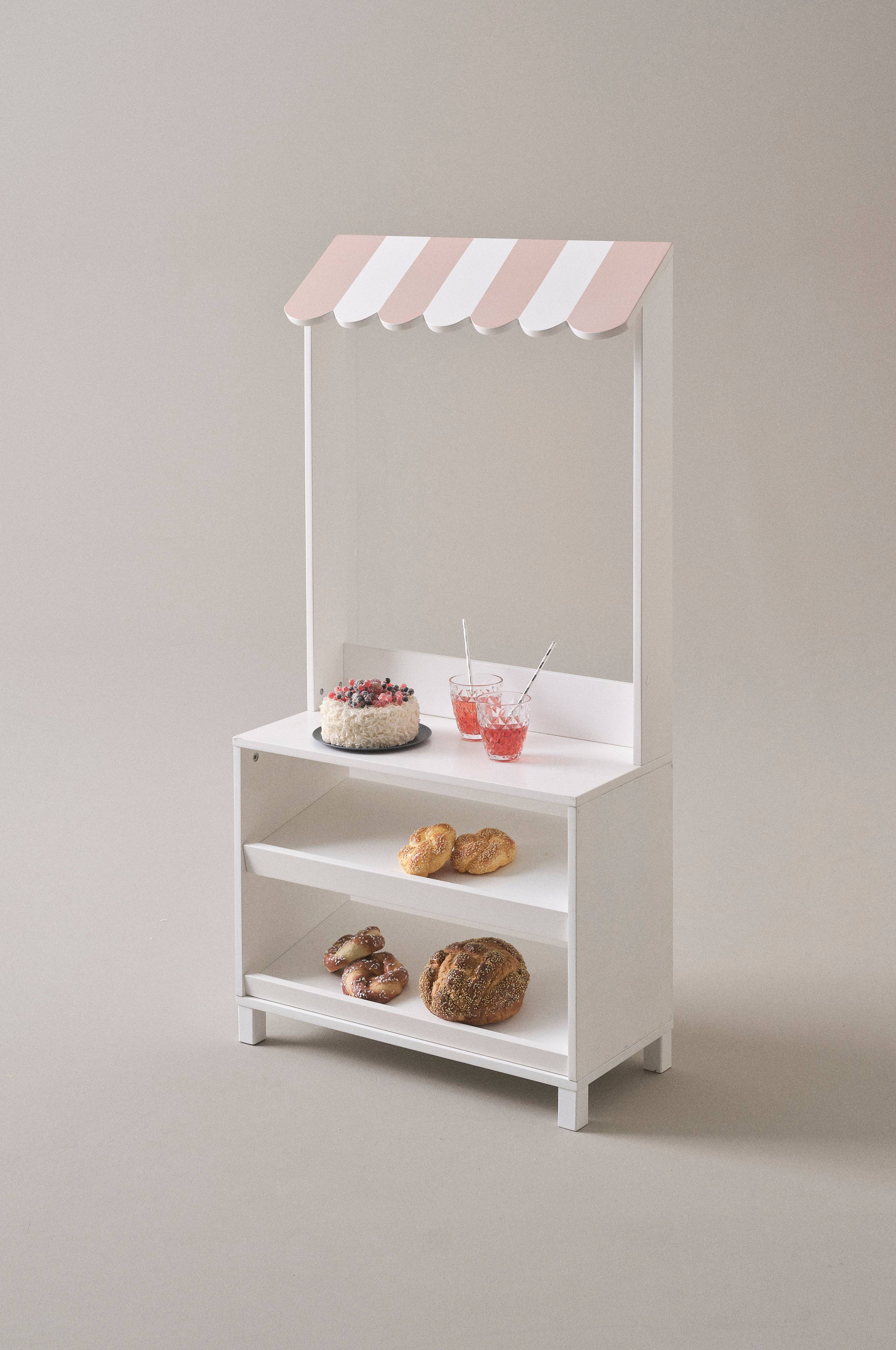 QUISCO on hieno, huolella tehty ja hauska lasten kioski FSC-sertifioitua mäntyä ja MDF-levyä. Reilun kokoisessa kioskissa on tiskin alla kaksi hyllytasoa ja pieni katto. Leikeissä se toimii parhaiten keskellä tilaa, mutta myös seinää vasten. Pinta on maalattu vesipohjaisella maalilla. Osittain koottava. Kokoamisohje mukana.