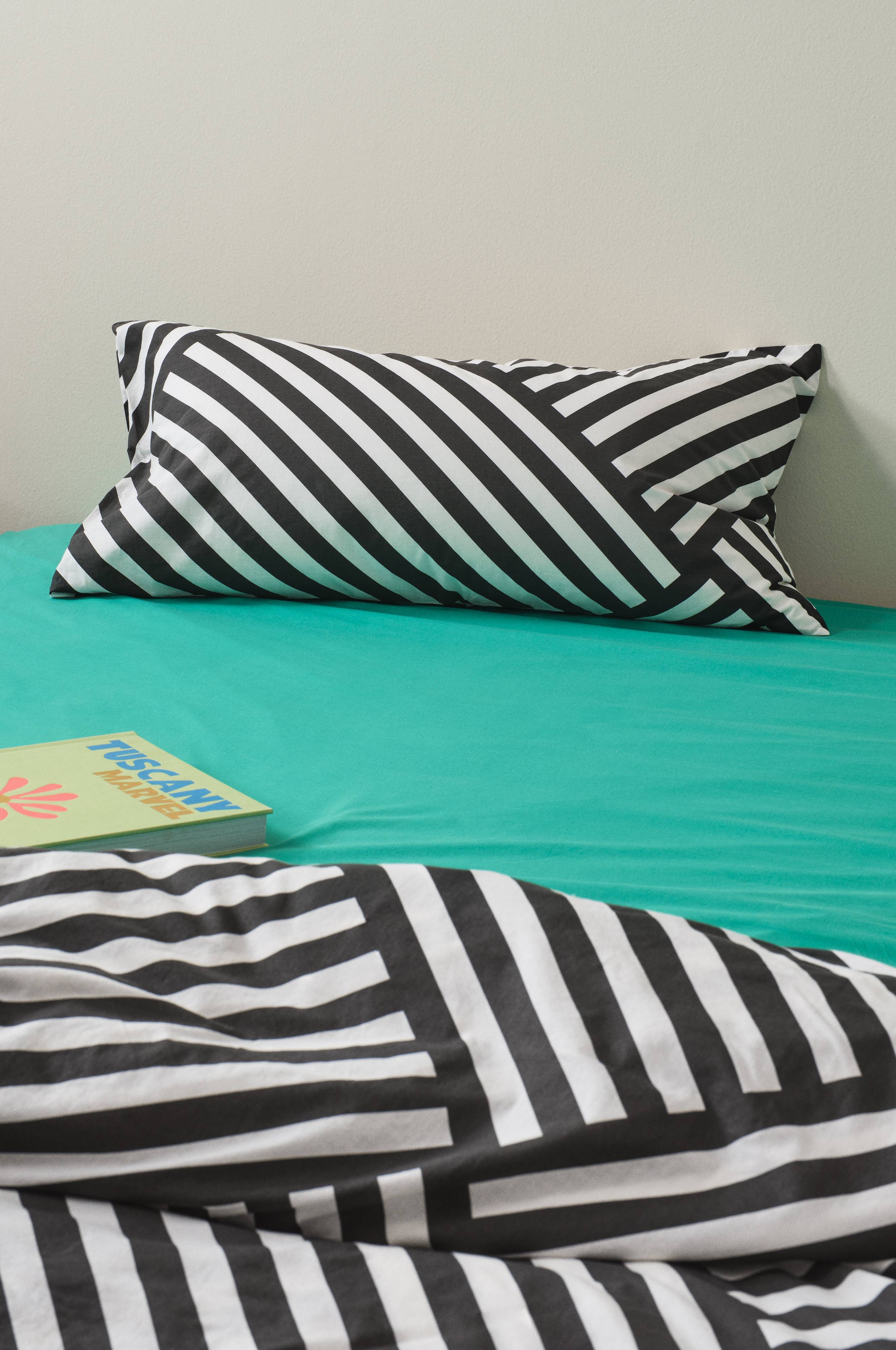 Kolmiosainen pussilakanasetti, jossa erikoisleveä pussilakana ja kaksi tyynyliinaa. Puuvillaa, jossa painettu, geometrinen raitakuvio. RIMA-sarjan vuodetekstiilit on vaatepesty erittäin pehmeiksi ja miellyttäviksi. Pussilakanan yläkulmissa on aukot, jotka helpottavat pussilakanan vetämistä peiton päälle. Pussilakanassa on painonappisuljenta. Langantiheys 144 tc. (Langantiheys kertoo lankojen lukumäärän, thread counts, neliötuuman alalla. Mitä suurempi langantiheys, sitä laadukkaampi kangas).