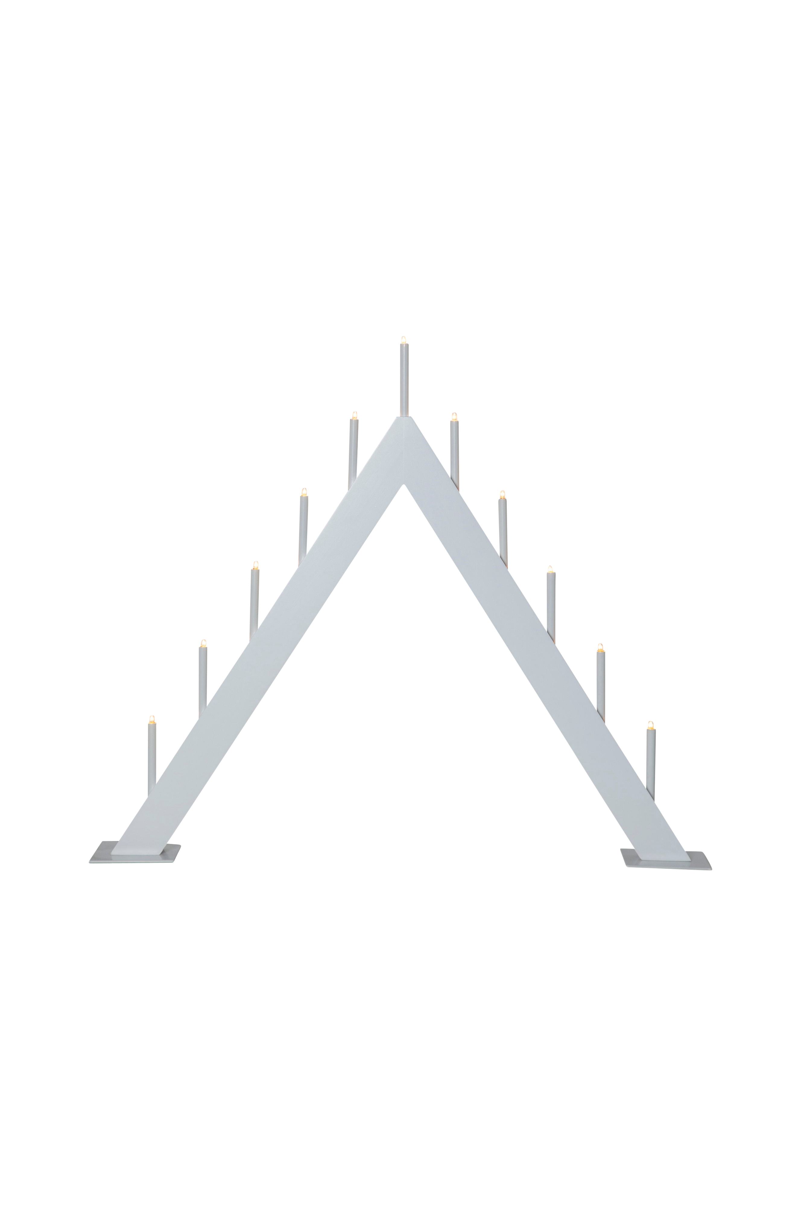 Pelkistetyn tyylikäs puinen sähkökynttelikkö, jossa valopidikkeet ohutta metalliputkea. 11 valonlähdettä, E5-lamput. Valkoinen/harmaa kangaspäällysteinen johto. Antaa tunnelmallista valoa ympäri vuoden. Teho 0,6 W.