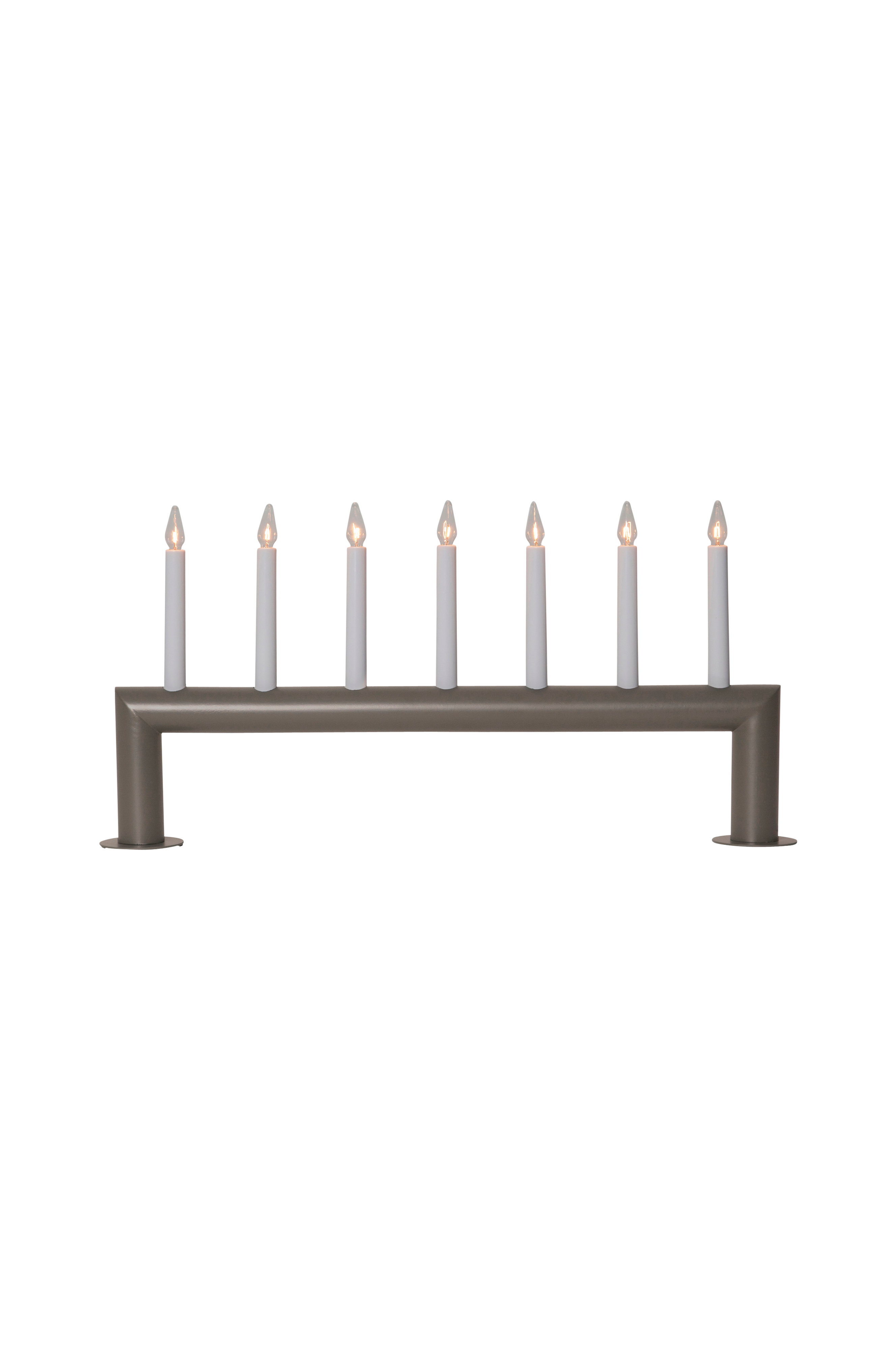 Puinen sähkökynttelikkö, jossa pyöreät metallialustat ja pyöristetty metallijalka. Moderni sähkökynttelikkö joulukoristeeksi. Kynttelikössä on 7 valonlähdettä. E10-lampunkanta, valonlähteet mukana. Harmaa/valkoinen kangaspäällysteinen johto, 180 cm. Korkeus 29 cm, leveys 58 cm ja syvyys 7 cm.