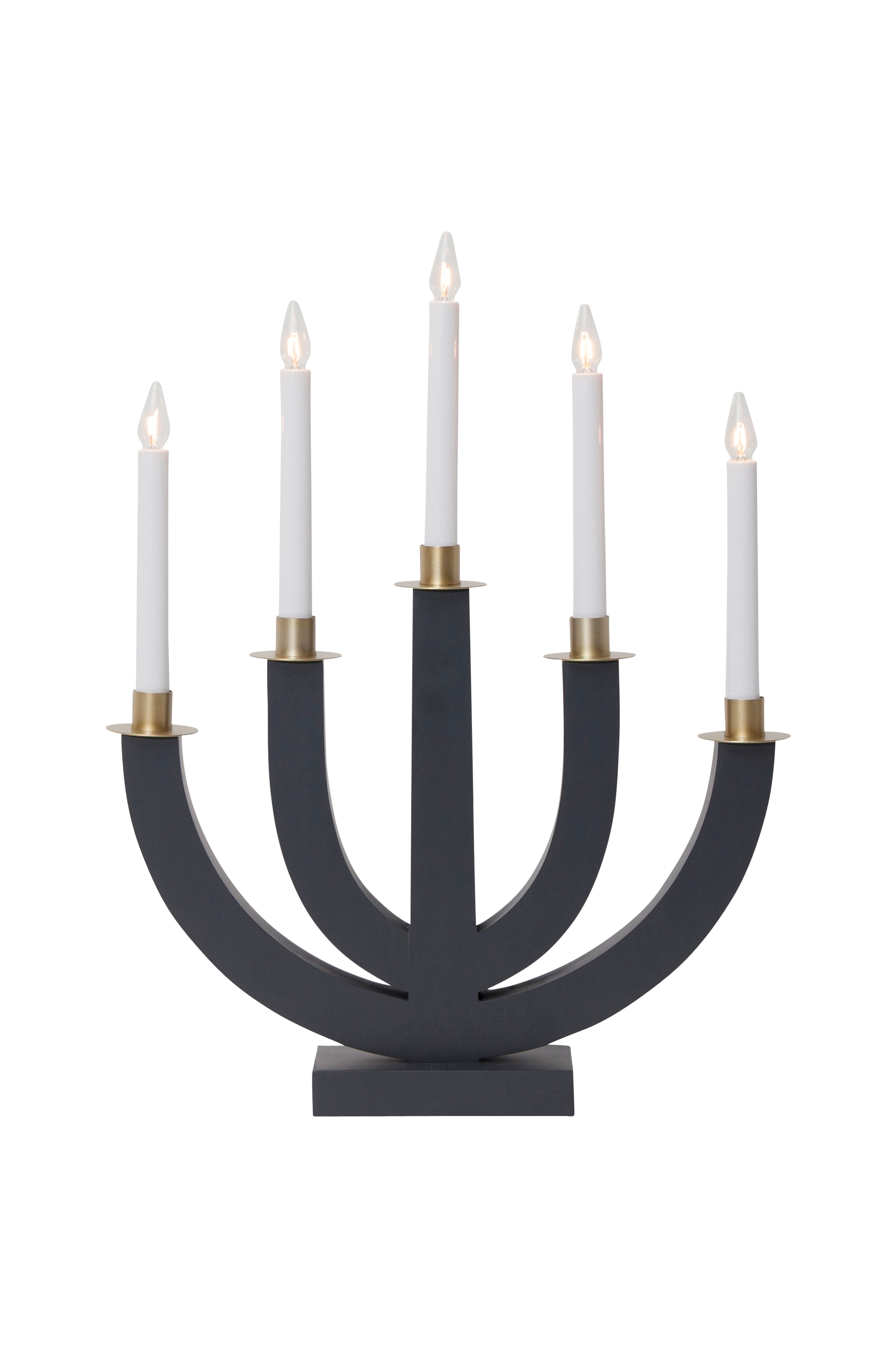 Puinen sähkökynttelikkö, jossa 5 valonlähdettä ja kullanväriseksi maalatut koristeet. Helppo sijoittaa ikkunaan ja huoneeseen esim. hyllyn tai kaapin päälle luomaan jouluista tunnelmaa. E10-lampunkanta, valonlähteet mukana. Valkoinen johto 180 cm. Korkeus 47 cm, leveys/pituus 37 cm ja syvyys 8 cm.
