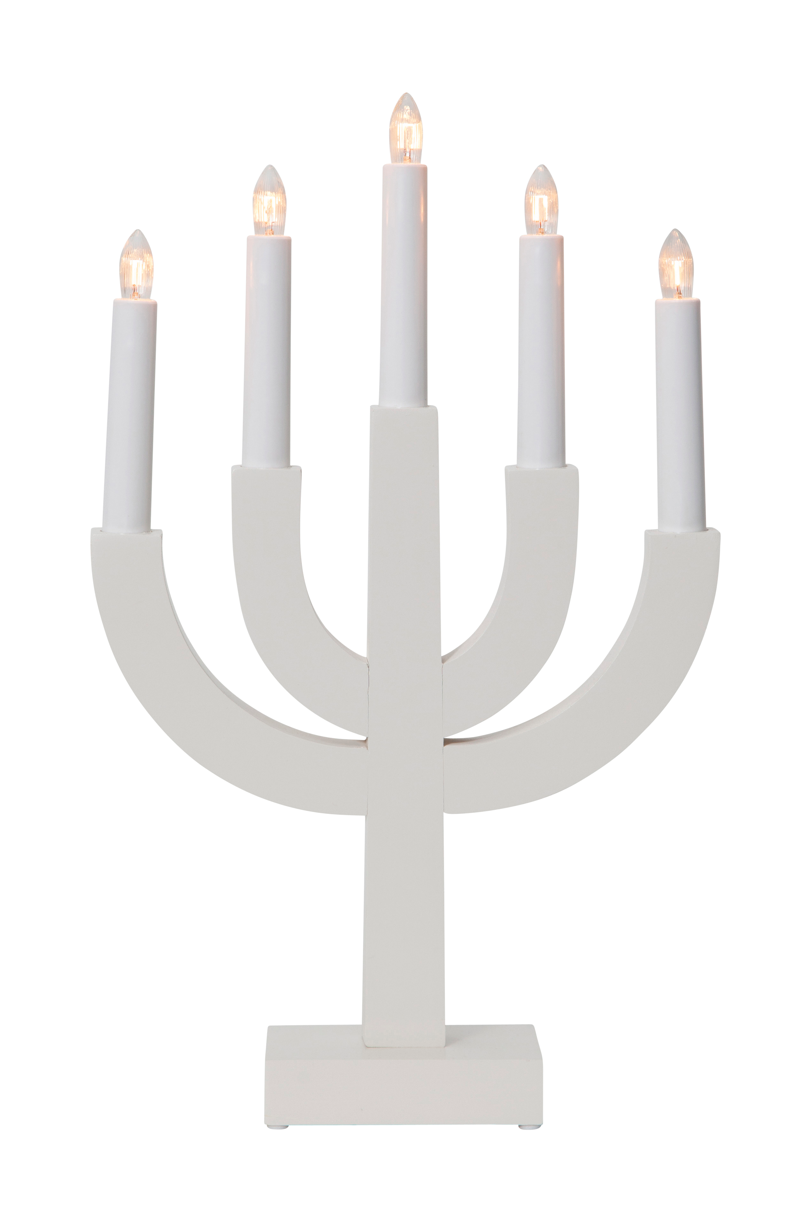 Puinen sähkökynttelikkö, jossa 5 valonlähdettä. Helppo sijoittaa pienen kokonsa ansiosta. Luo kaunista joulutunnelmaa ikkunaan ja huoneeseen asettamalla kynttelikkö esim. hyllyn tai kaapin päälle. E10-lampunkanta, valonlähteet mukana. Valkoinen johto, 180 cm. Korkeus 40 cm, leveys/pituus 25 cm ja syvyys 8 cm.