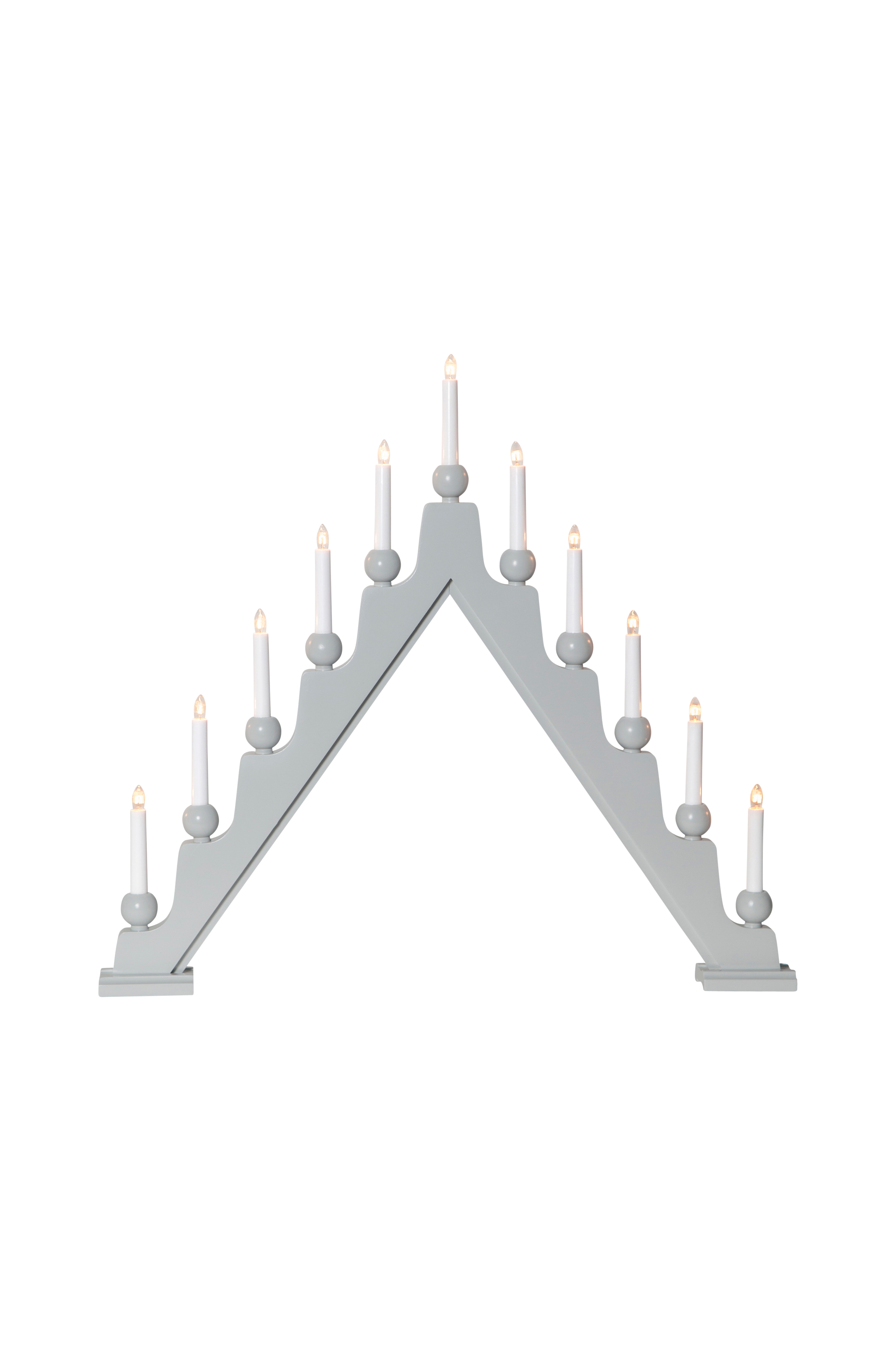 Puinen sähkökynttelikkö, jossa pyöreät kynttilänpidikkeet. Kaunis kynttelikkö tuo kotiin jouluista tunnelmaa. Kynttelikössä on 11 valonlähdettä. E10-lampunkanta, valonlähteet mukana. Valkoinen johto, 180 cm. Korkeus 69 cm, leveys/pituus 75 cm ja syvyys 8 cm.