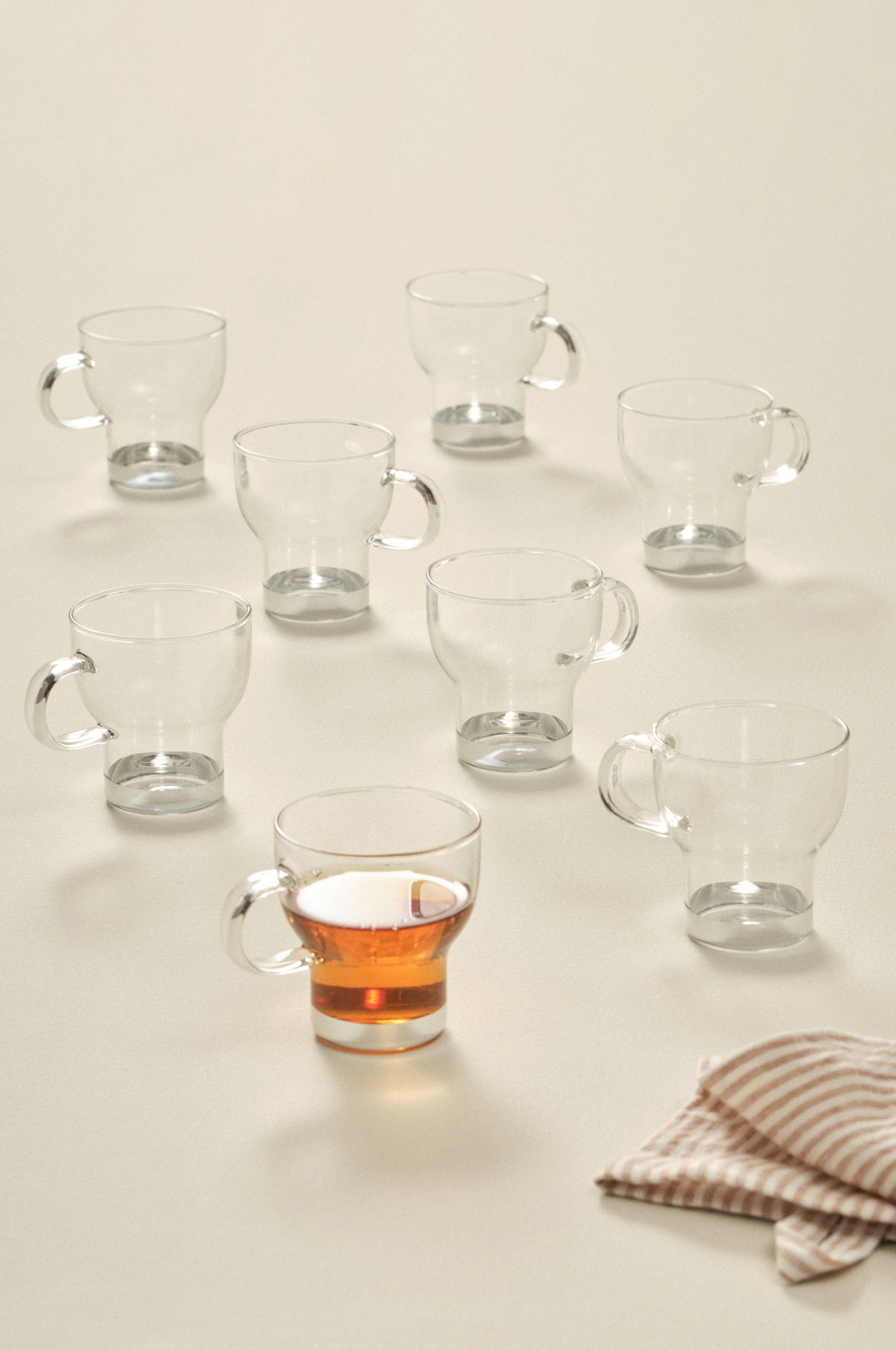 8 lasista kuppia. Kaunismuotoisissa kirkkaasta lasista valmistetuissa kupeissa on kahva, jonka ansiosta niistä on mukava juoda myös kuumia juomia.