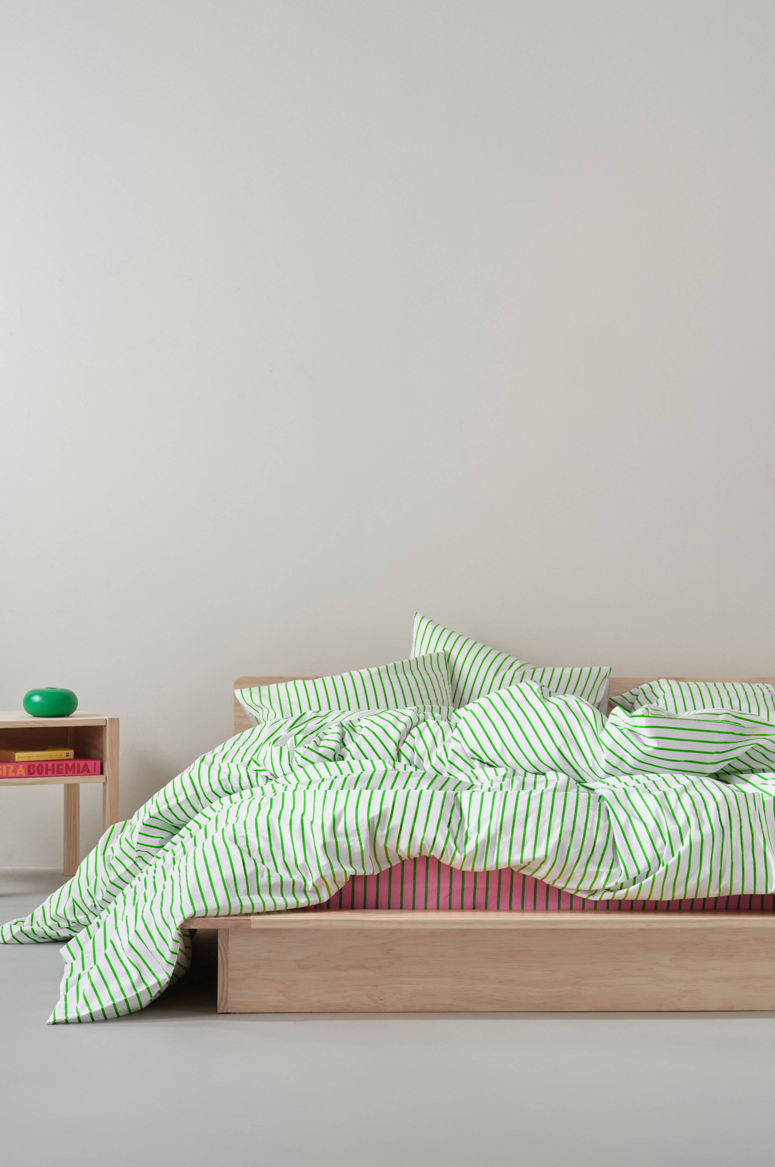 Ekologisesta puuvillasta valmistettu SIMA-sängynpeitto. Ylellinen mukavuus, jossa on erittäin leveä pussilakana. Painetut raidat raikkaissa väreissä. Kätevät pussilakanan käsiaukot helpottavat. Muuta makuuhuoneesi levolliseksi paikaksi.