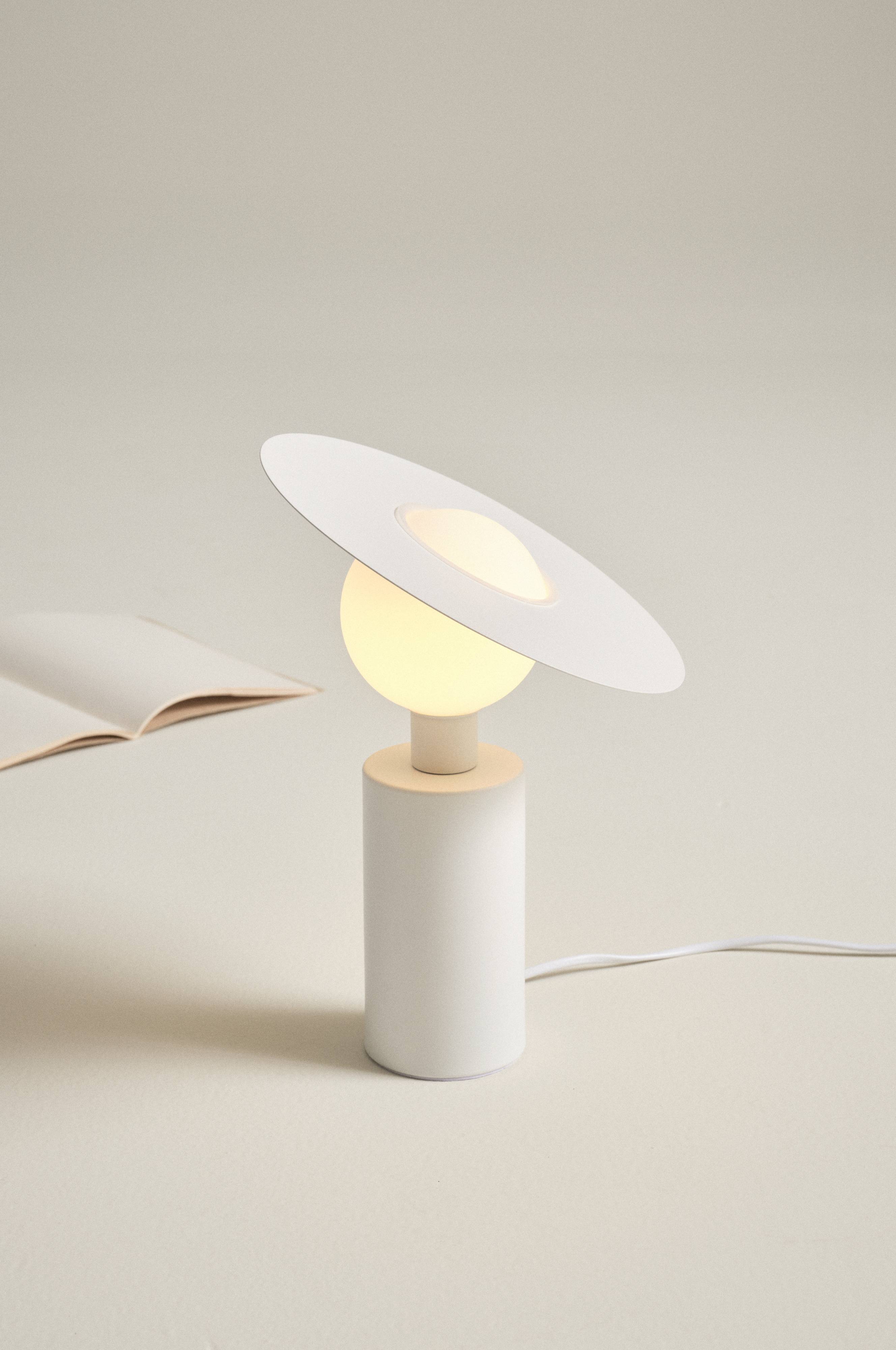 Mielenkiintoinen metallinen pöytävalaisin, jossa pyöreä valkoinen opaalilasikupu. Valaisin valaisee joustavasti varjostimen ansiosta. Varjostimen voi sijoittaa kupuun haluamallaan tavalla ja luoda tunnelmallista valoa. Musta johto, jossa virtakatkaisin.