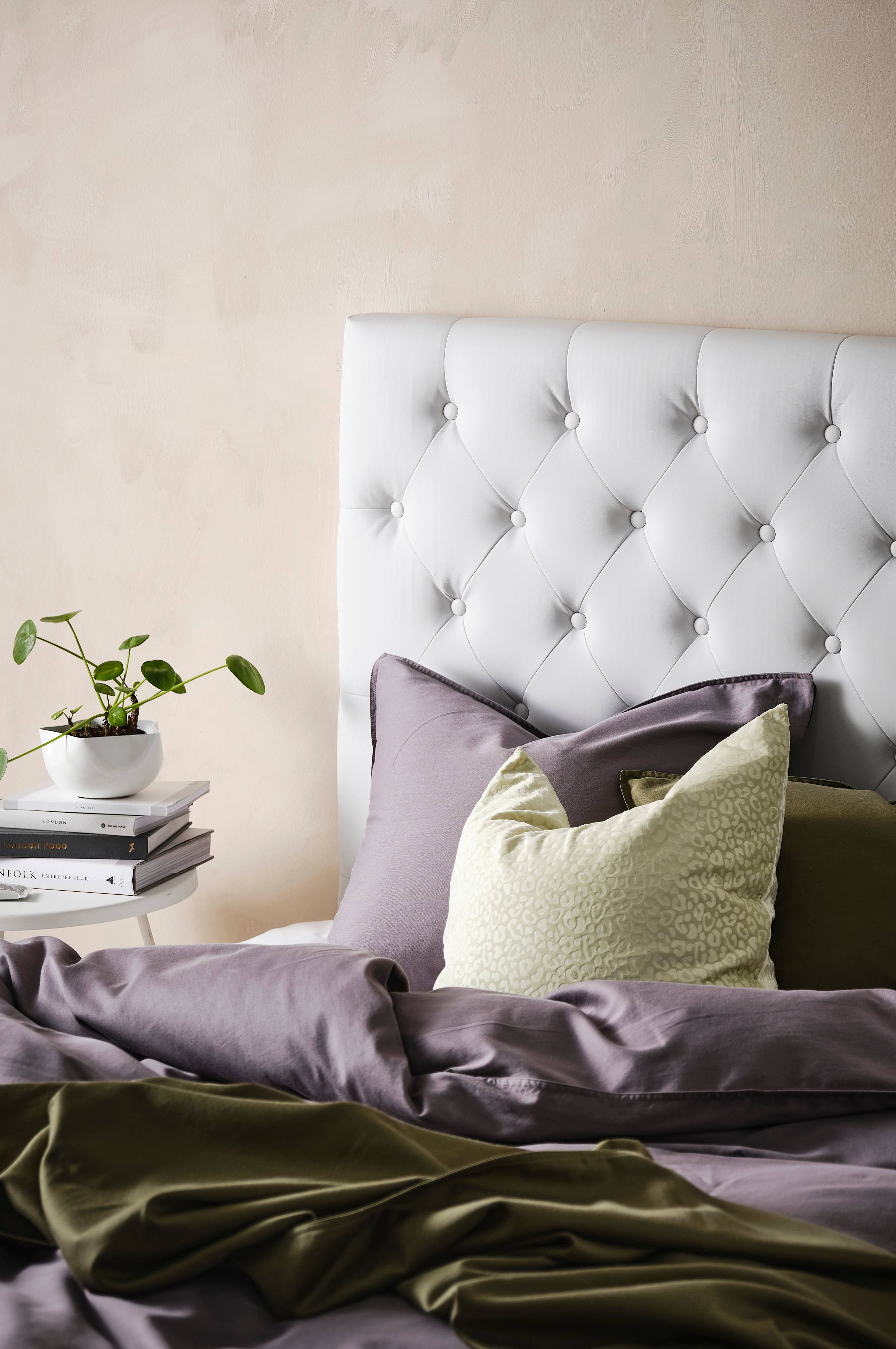 Vinkki: Päätyä ei tarvitse kiinnittää seinään, se pysyy pystyssä sängyn ja seinän välissä.Lisää hotellitunnelmaa saat petaamalla vuoteeseen ylelliset lakanat.