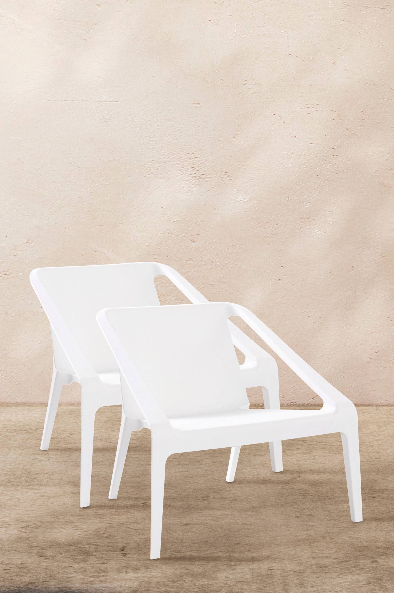 Loungetuolit valettua muovia, 2/pakkaus. Mukava loungetuoli, jossa istuin muotoonvalettua polypropeenia. Pinottavat tuolit on helppo ottaa esiin ja siirtää sivuun.
