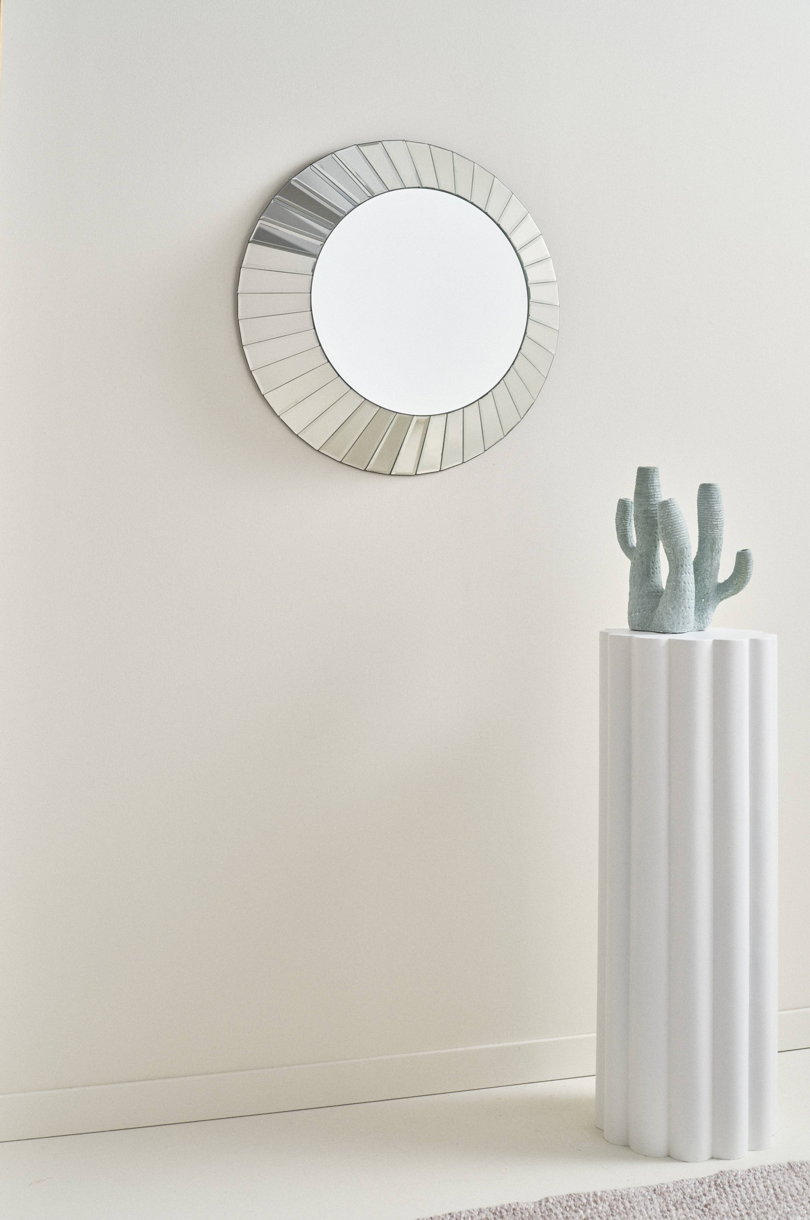 Pyöreä peili, jossa mielenkiintoinen muoto. Peilin ympärillä oleva kehys koostuu pitkistä kapeista peilimosaiikeista, jotka muodostavat kauniin kehyksen samalla, kun peili tulee hieman ulos seinästä. Runko FSC-sertifioitua MDF-levyä. Takana kaksi metallirengasta ripustusta varten.