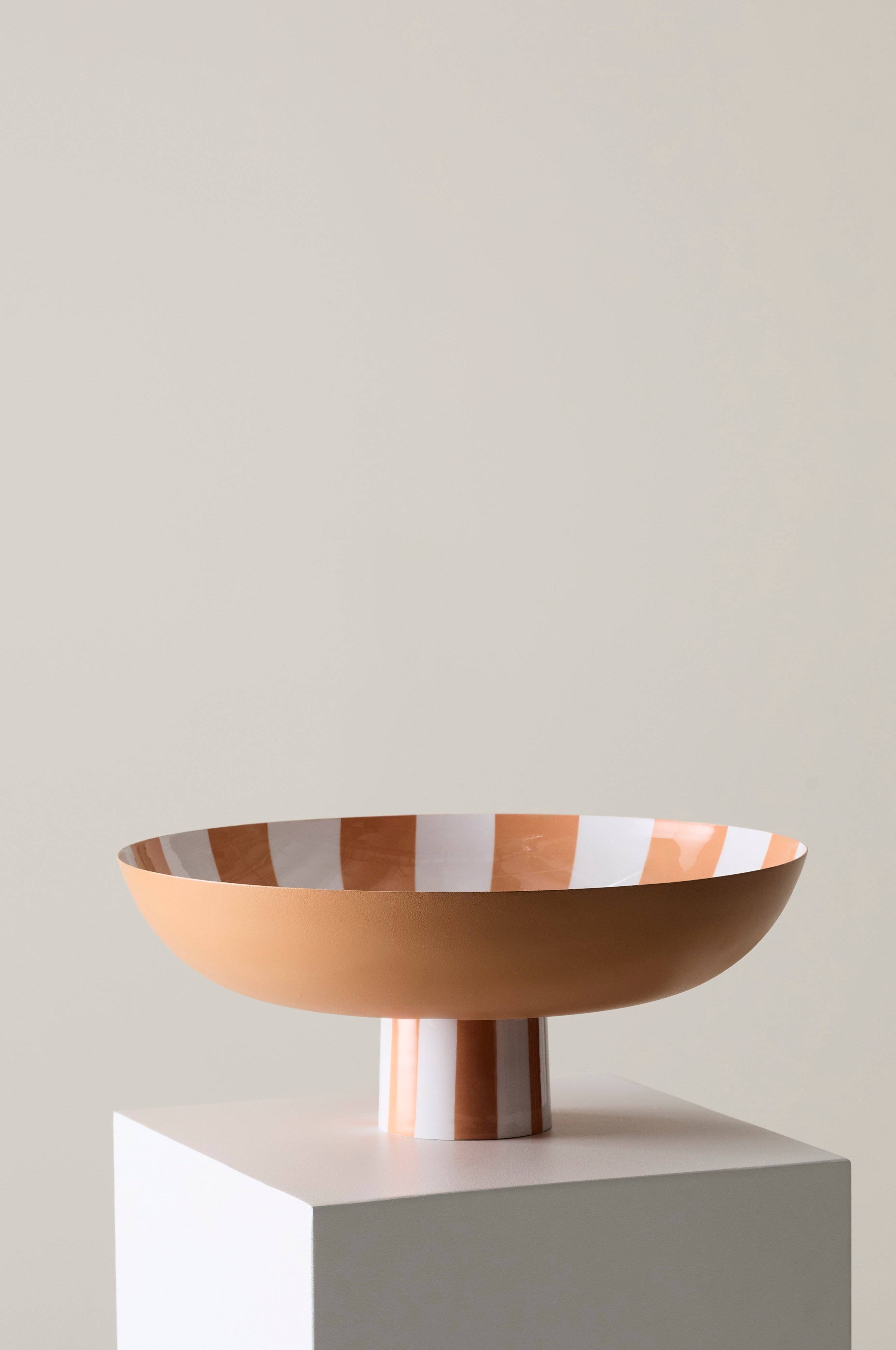 TOWER STRIPES lumoaa iloisella muotoilulla. Koristekulho on valmistettu raudasta. Sen sisäpuoli ja jalka häikäisevät raitakuvioinnilla, joka muodostaa kontrastin sen ulkopinnan yksiväriseen väriin.