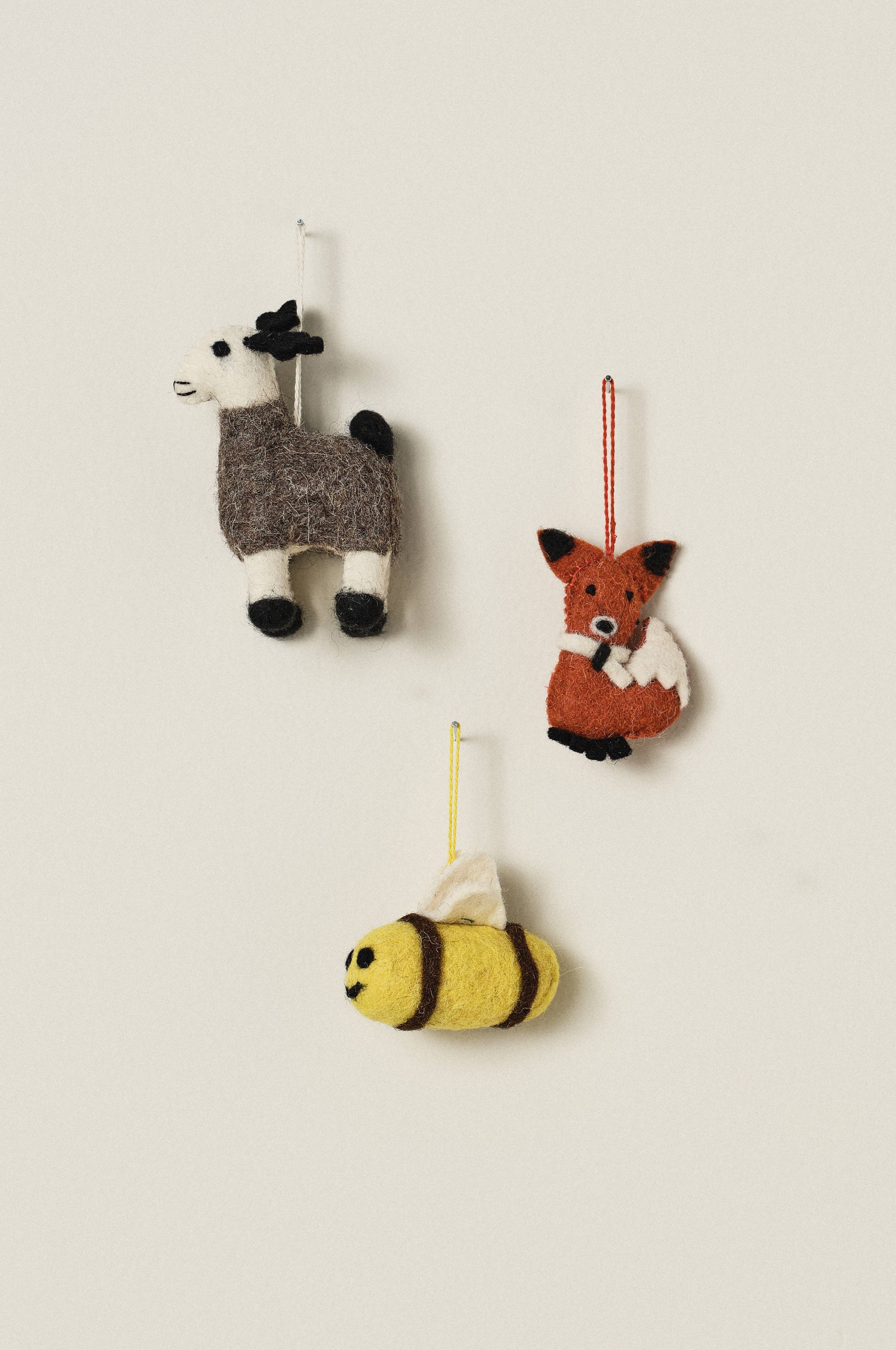 Käsintehdyt hahmot luonnollista, huovutettua villaa. 3/pakkaus. Kolme pehmustettua pientä eläintä, jotka esittävät mehiläistä, kaurista ja kettua. Kaikissa on pieni ripustuslenkki, joten voit ripustaa ne vaikkapa joulukuusen koristeiksi. Käsityö tekee jokaisesta eläimestä ainutlaatuisen.