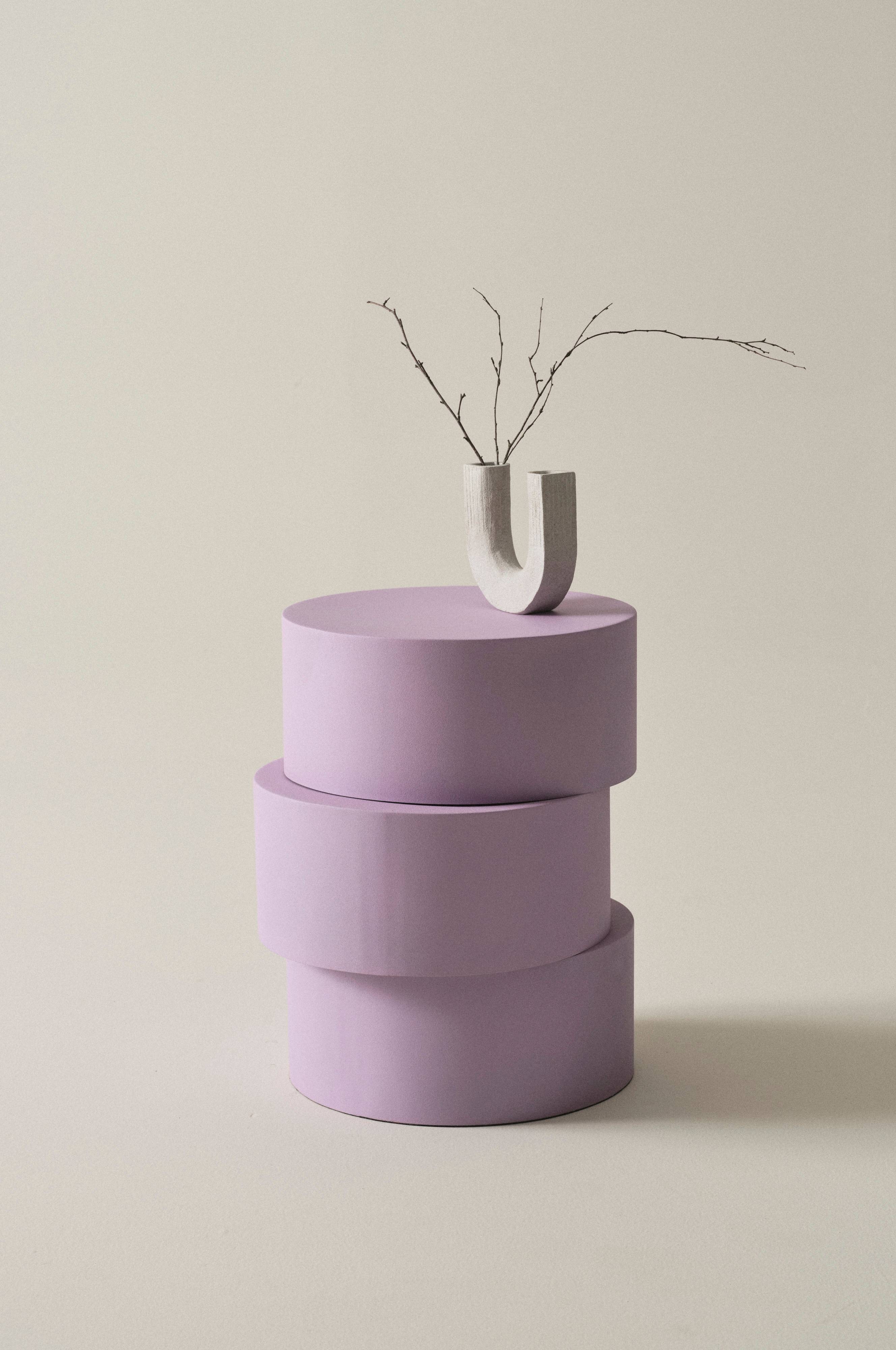 Pyöreä rautainen sivupöytä, jonka kolme osaa on sijoitettu epäsymmetrisesti, mikä antaa pöydälle jännittävän muodon. Yksivärinen sivupöytä, jossa jauhemaalattu mattapinta. Erikoinen sivupöytä saa ystävät kohottamaan kulmakarvojaan.