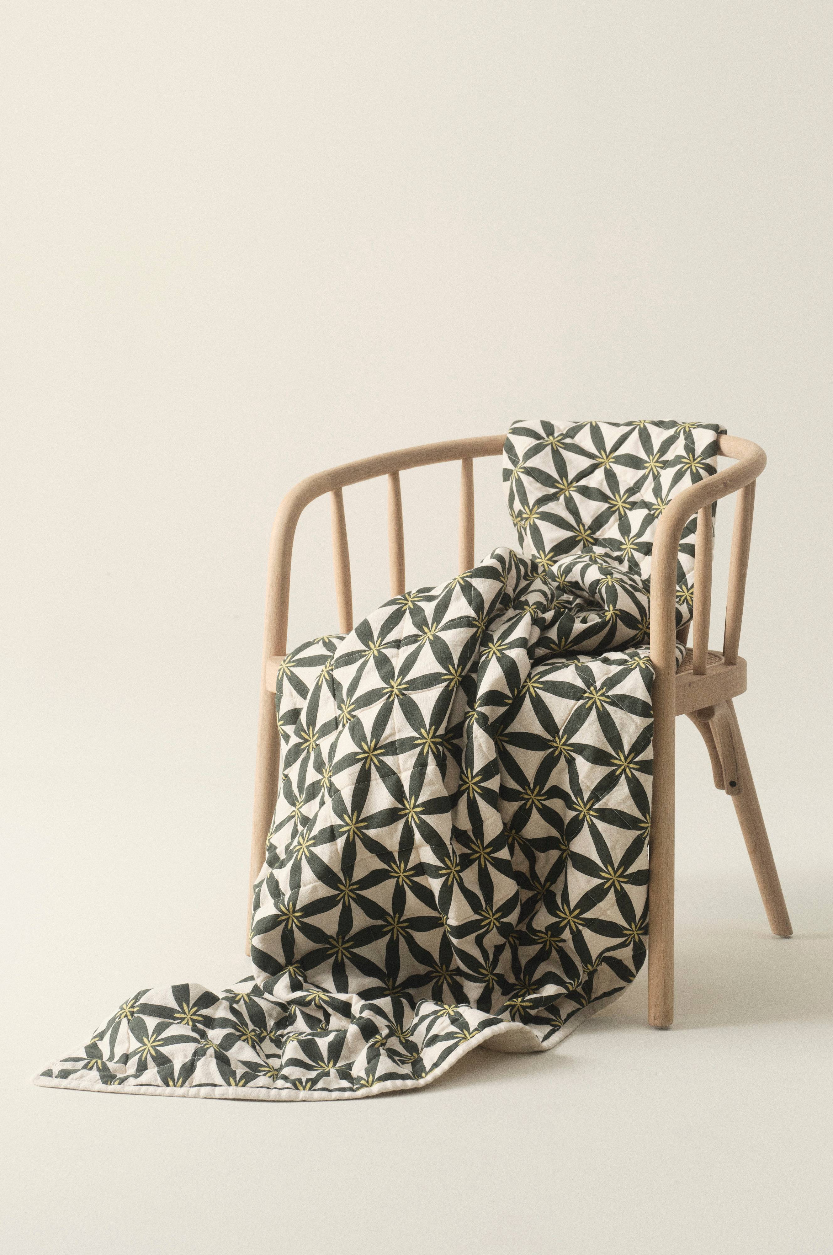 Kevyesti topattu torkkupeitto vaatepestyä puuvillaa, jossa on kuviopainatus vaalealla pohjalla. Yksivärinen takaosa on kaksikerroksista musliinia, joka on pehmeää ja miellyttävää. Torkkupeiton ympärillä oleva reuna on samanvärinen kuin takaosa. Torkkupeitto on tikattu koristeellisilla saumoilla, jotka pitävät täytteen paikoillaan. Täyte polyesteriä.