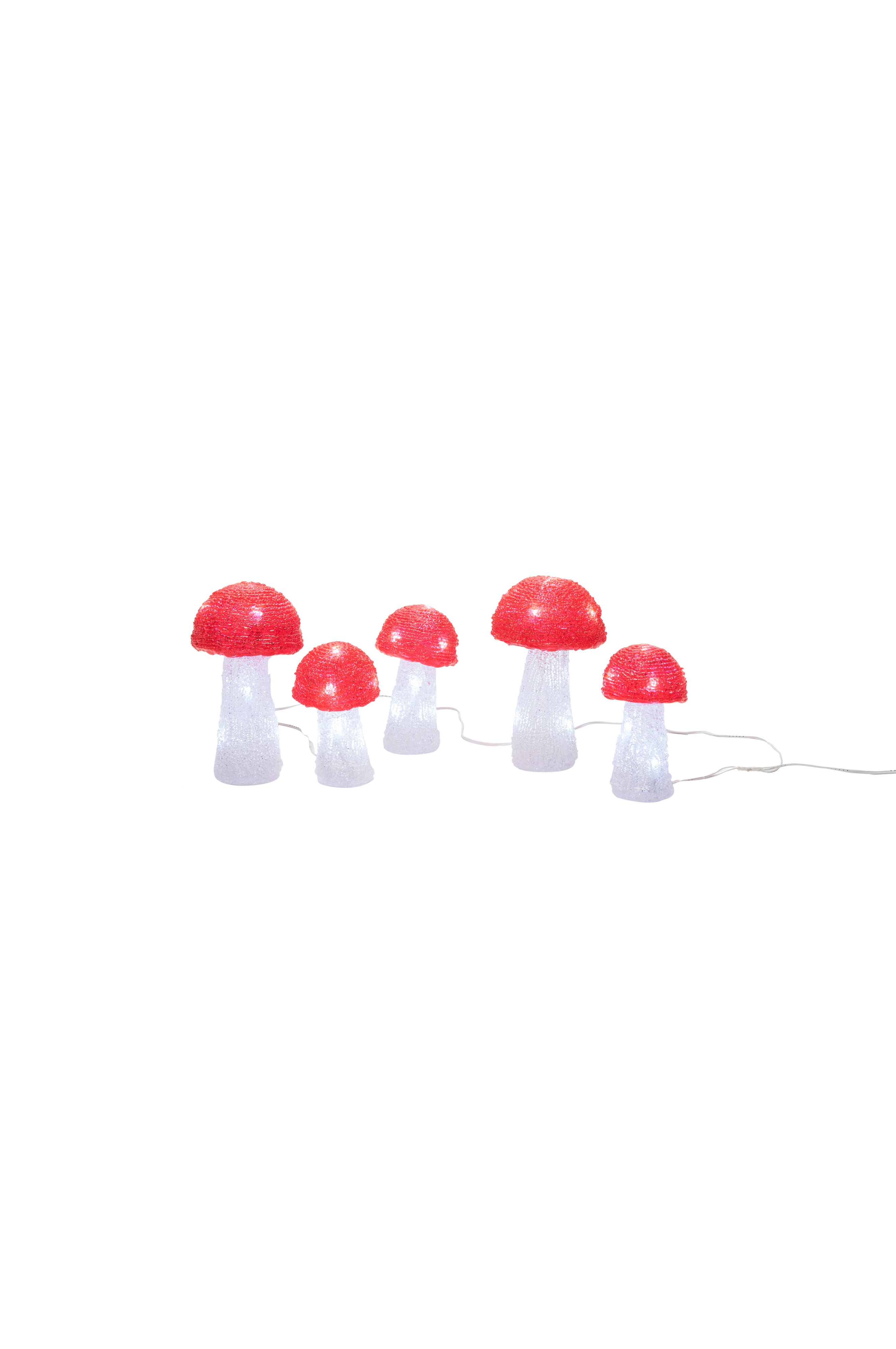 Akryylivaloköynnös, jossa 5 sientä. 40 lämpimän valkoista LED-lamppua, jotka soveltuvat sekä sisä- että ulkokäyttöön. Sienten etäisyys on 1 metri ja läpinäkyvä liitäntäjohto on 5 metriä pitkä. Toimii 24 V:n muuntajalla. Korkeus 13-17 cm
