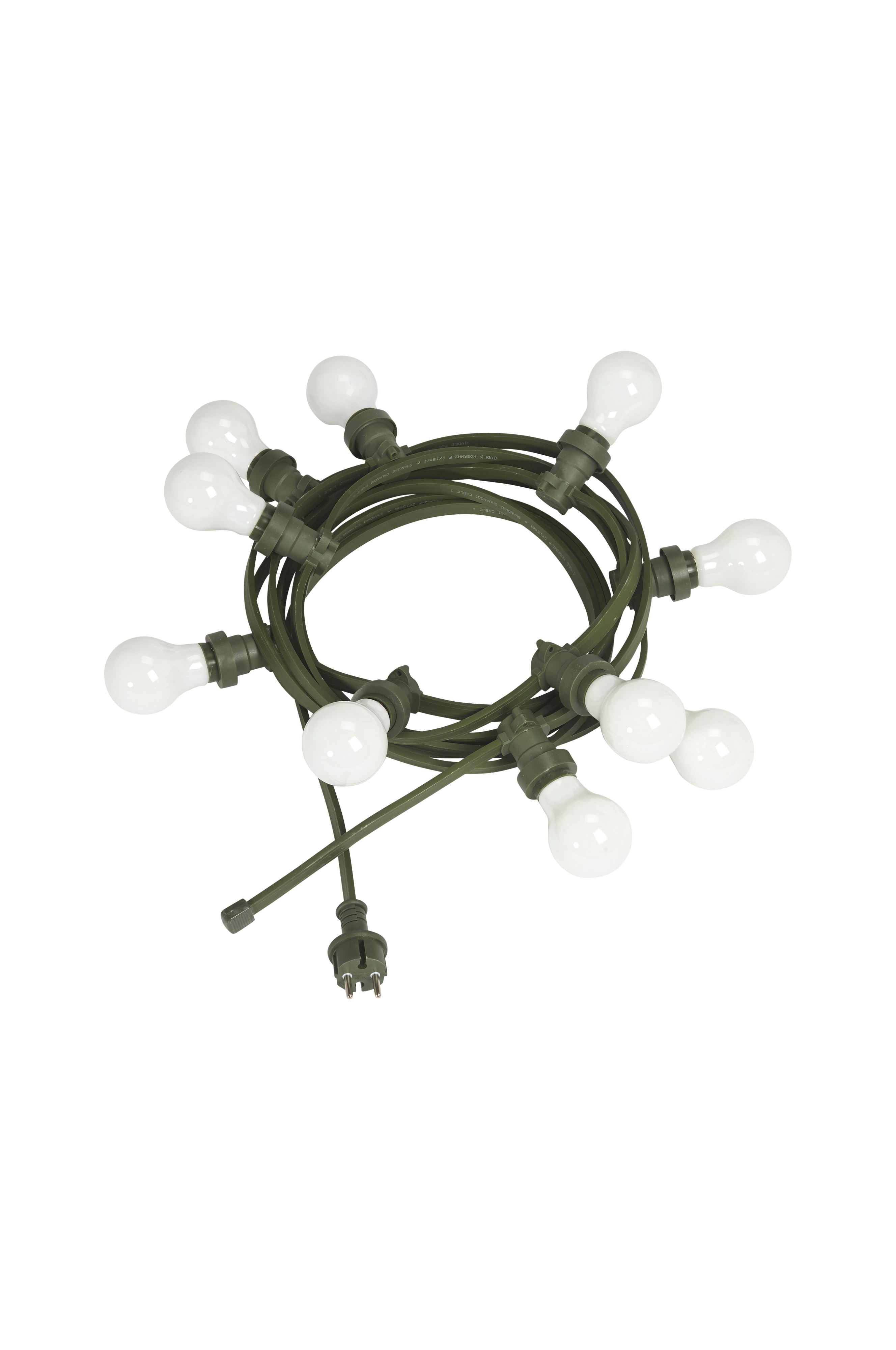 Ulkokäyttöön sopiva tyylikäs ja eleetön valosarja, jossa 10 opaalivalonlähdettä.