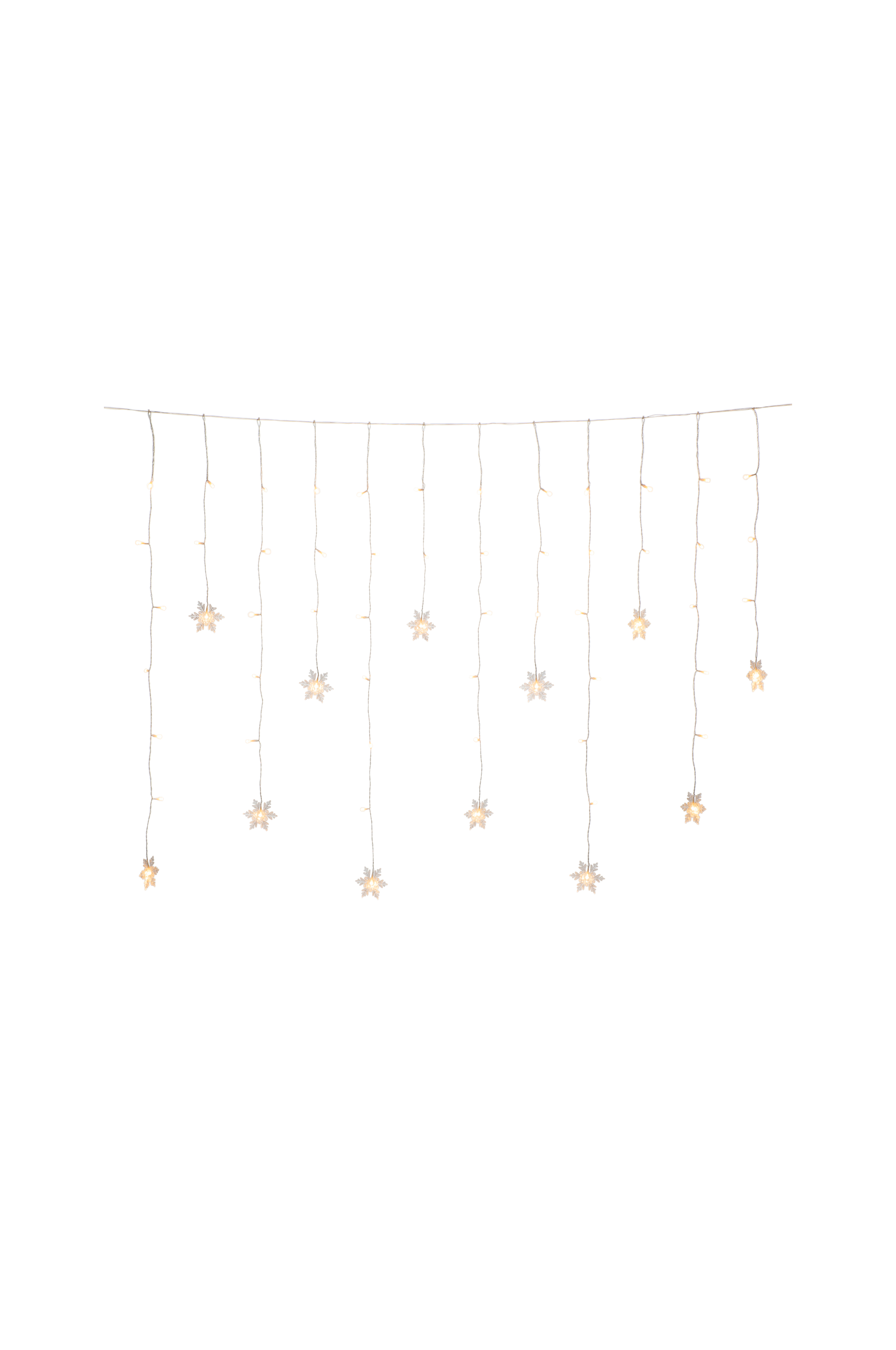 Valoverho, jossa 12 lumihiutaletta ja 60 lämpimän valkoista LED-lamppua. Ulkokäyttöön. Toimii 4,5 voltin muuntajalla. Liitäntäjohto 10 metriä. Korkeus 120 cm, leveys 140 cm.