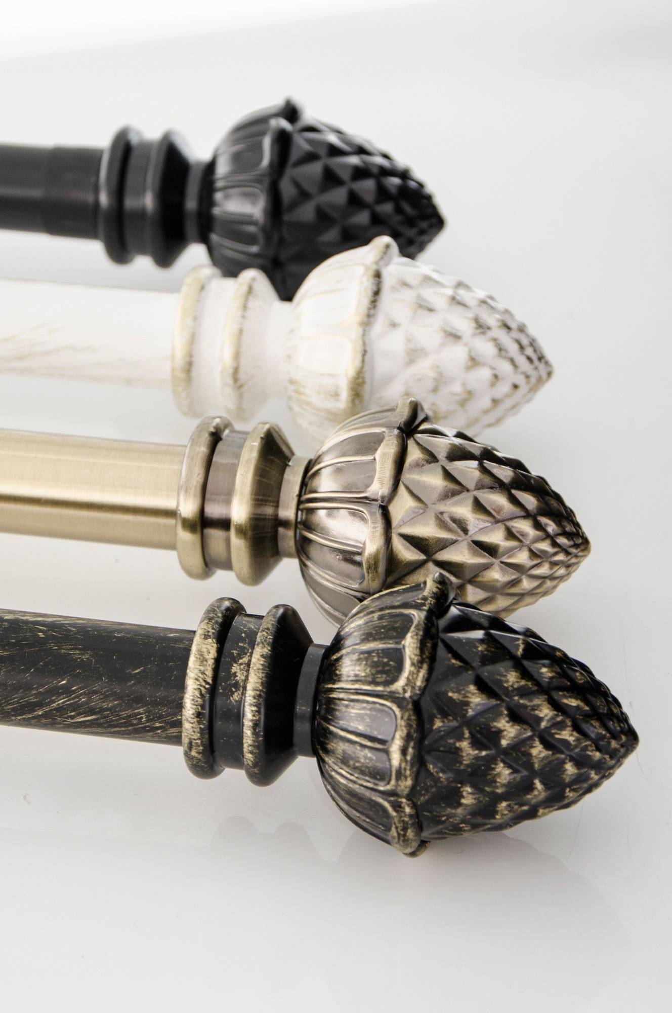 Täydellinen klassinen verhotankosetti metallia, 25/28 mm. Setti sisältää säädettävät tangot 130-240 cm, 2 päätynuppia ja 3 säädettävää seinäkiinnikettä (9-14 cm). Päätynupin pituus 9 cm.