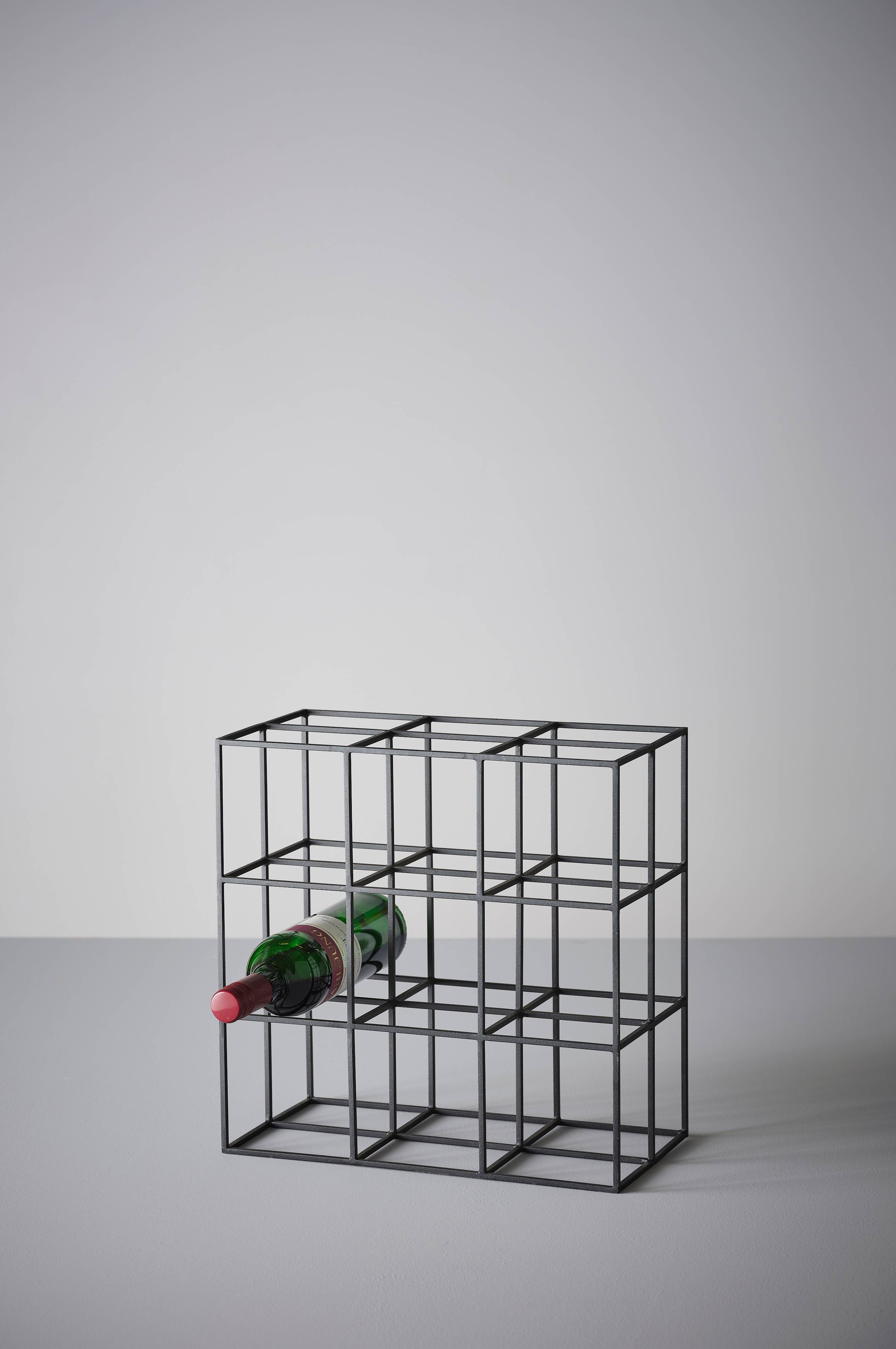 Viinipulloteline, johon mahtuu yhdeksän pulloa. Valmistettu nelikulmaisesta metalliprofiilista, joka antaa selkeän, helposti sijoitettavan muodon.