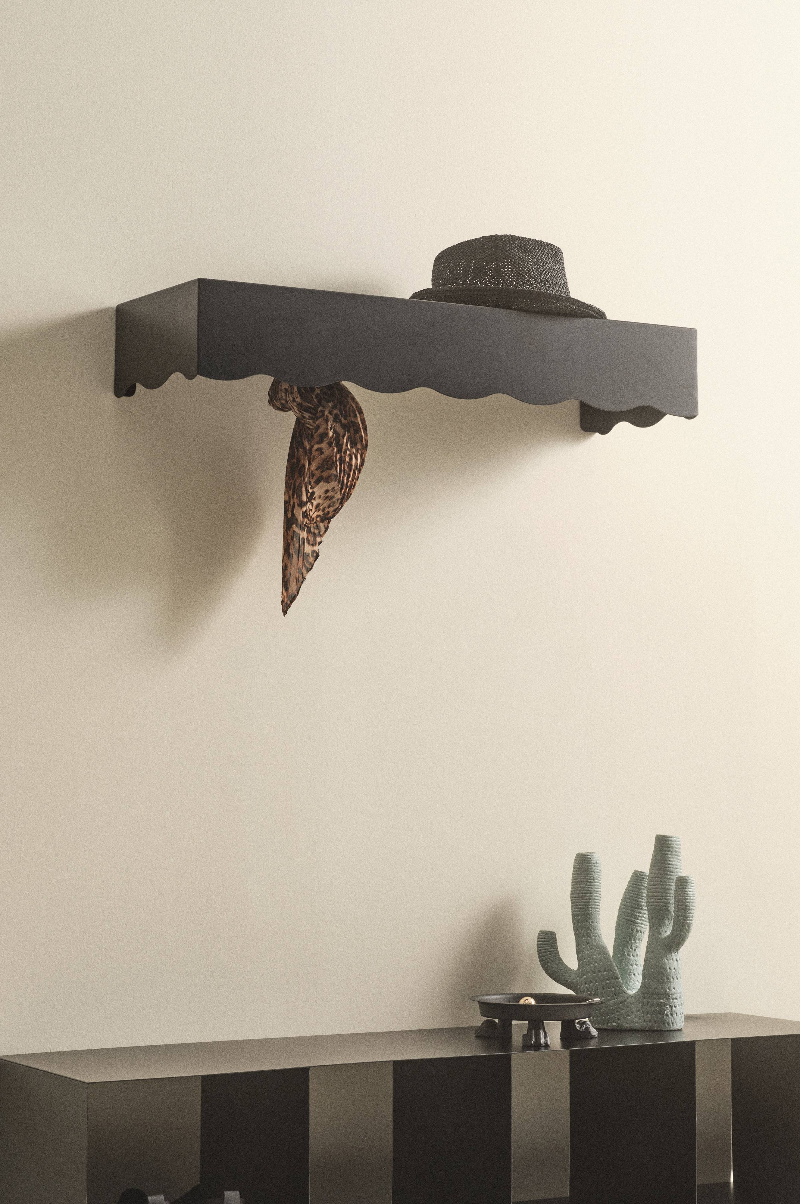 Seinähylly terästä. Hyllyssä on viisi piilotettua tuplakoukkua hyllyn kolmella sivulla kulkevan aaltomaisen reunan takana. Ripustuskoukut on muotoiltu käytännöllisesti siten, että vaatteet ja laukut eivät pääse liukumaan. Takareunassa on pienet reiät, joiden ansiosta hylly on helppo ruuvata seinään kiinni.
