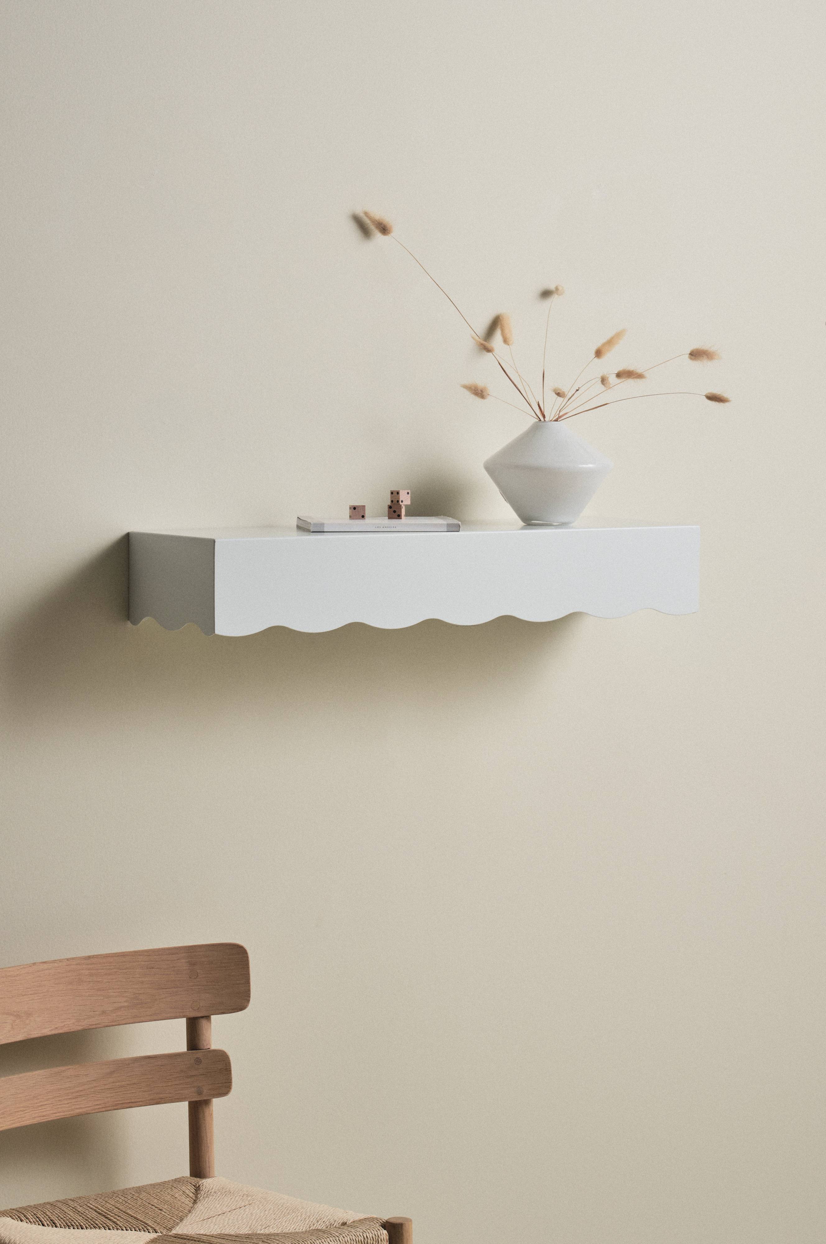 Teräksinen seinähylly, jossa aaltomainen alareuna kolmella sivulla. Takareunassa on pienet reiät, joiden ansiosta hylly on helppo ruuvata seinään kiinni.